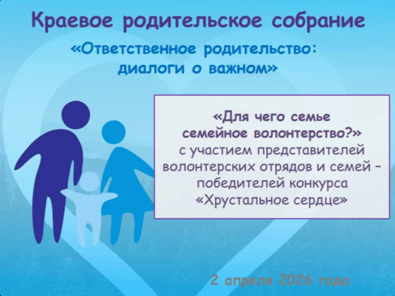 2 апреля 18.30 состоится Краевое родительское собрание на тему «Для чего семье семейное волонтерство?» с участием представителей волонтерских отрядов и семей – победителей конкурса «Хрустальное сердце» Уважаемые родители! Для возможности задать вопрос — авторизуйтесь в аккаунте Яндекса