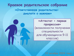 КРС «Аттестат + первая профессия» От admin14.10.202423.10.2024Без рубрики 3 октября 2024 г. в 18.30 состоялось краевое родительское собрание на тему «Аттестат + первая профессия» (возможности получения специальности для обучающихся 9-10 классов). Ссылка на запись