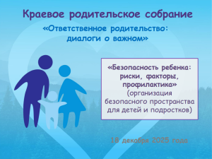 КРС «Безопасность ребенка: риски, факторы, профилактика» (организация безопасного пространства для детей и подростков) От admin19.12.2025Без рубрики 18 декабря 2025 г. в 18.30 состоялось краевое родительское собрание на тему «Безопасность ребенка: риски, факторы, профилактика» (организация безопасного пространства для детей и подростков) Ссылка на запись